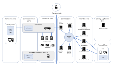 - dezentrale Infrastruktur, zu der Komponenten zur Authentifizierung und sicheren Datenübermittlung in die zentrale Infrastruktur zählen (§ 306 Abs. 2 Nr. 1 SGB V),